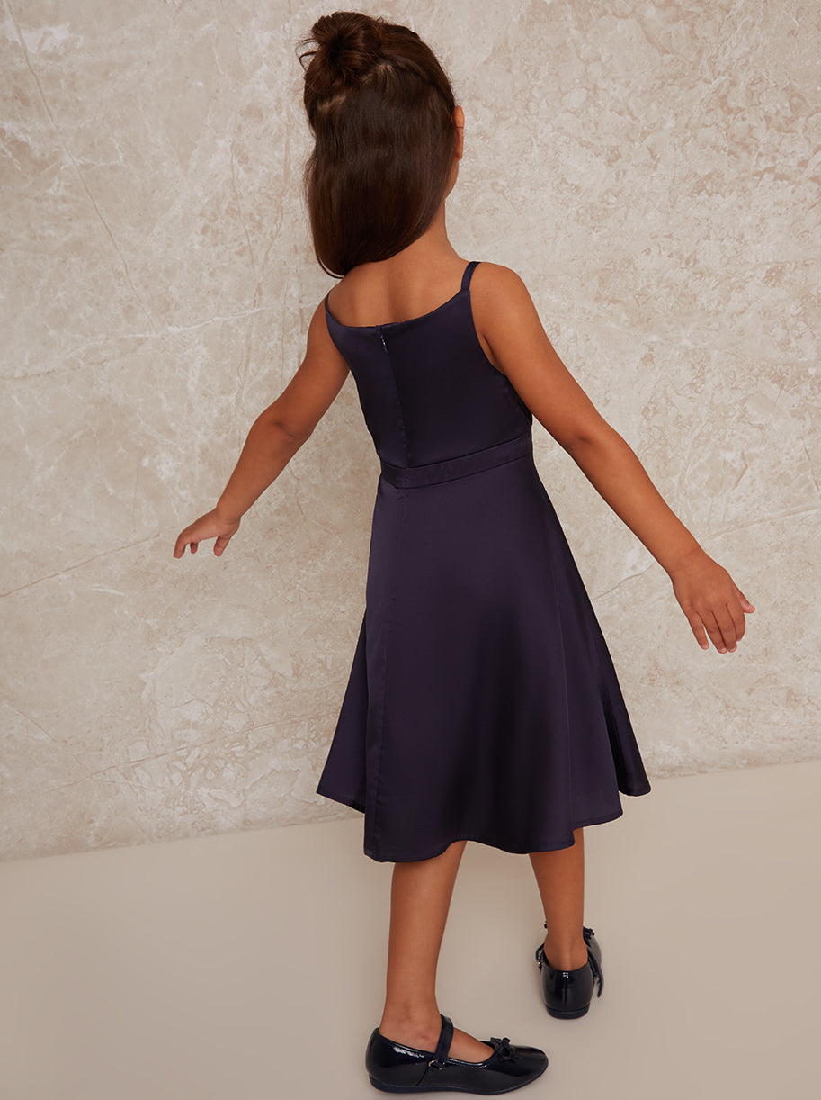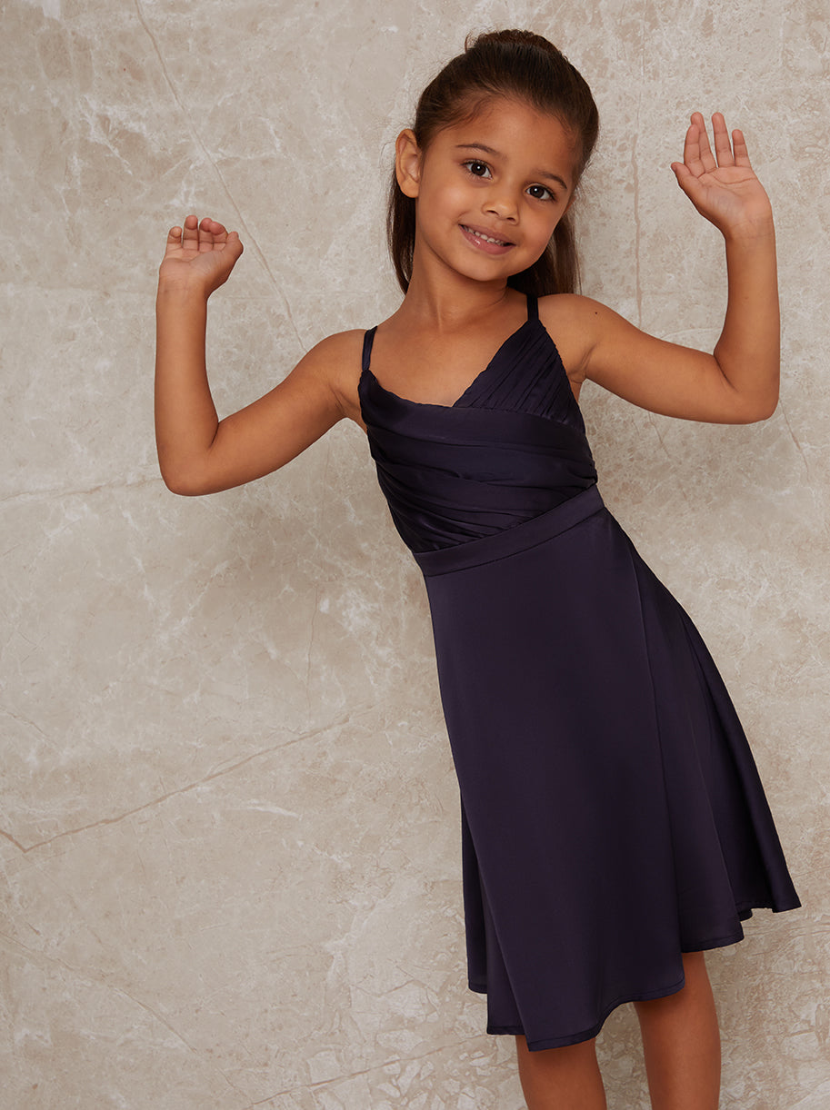 Girls Pleat Bodice Satin Finish Dress in Navy Blue