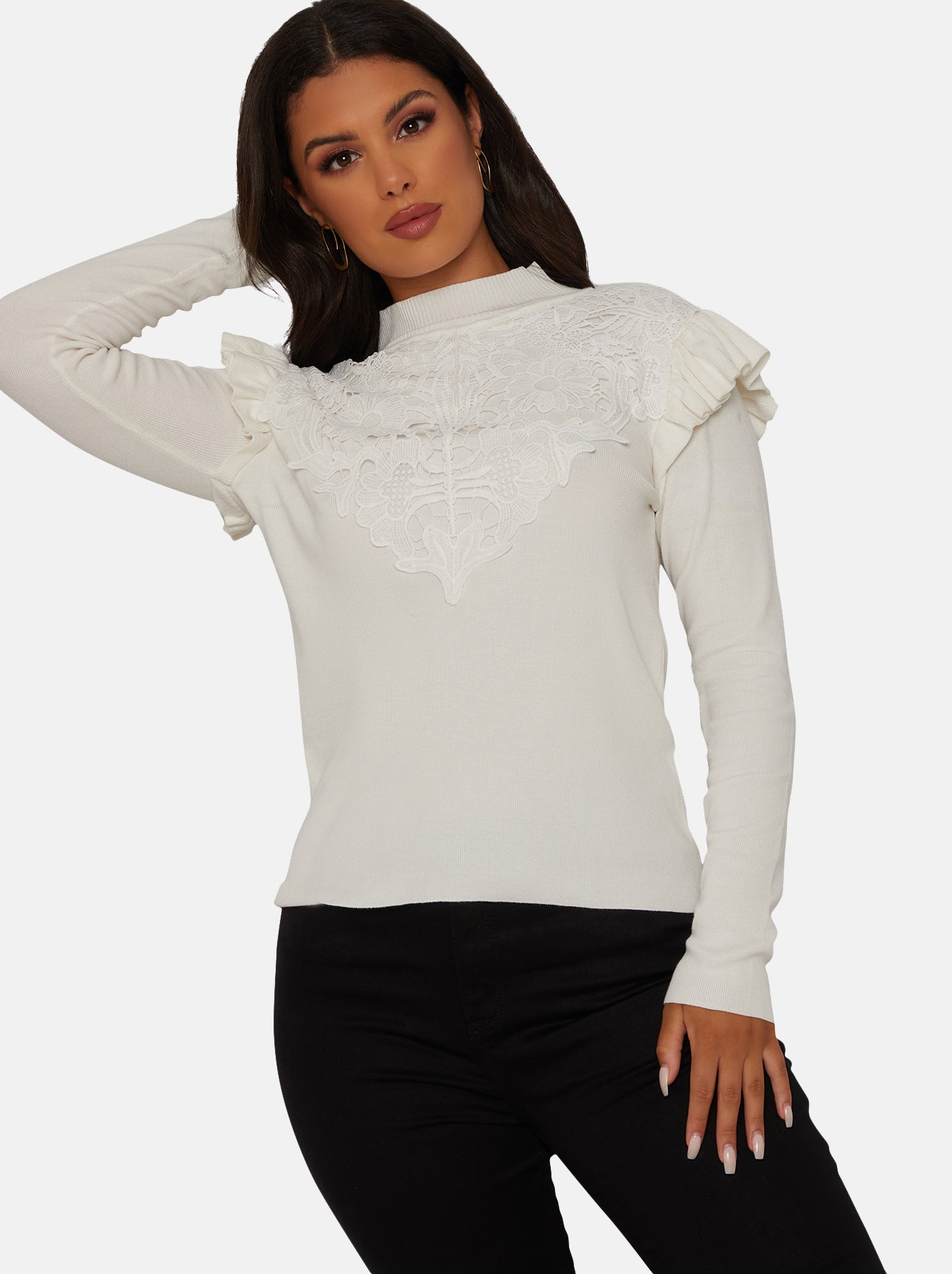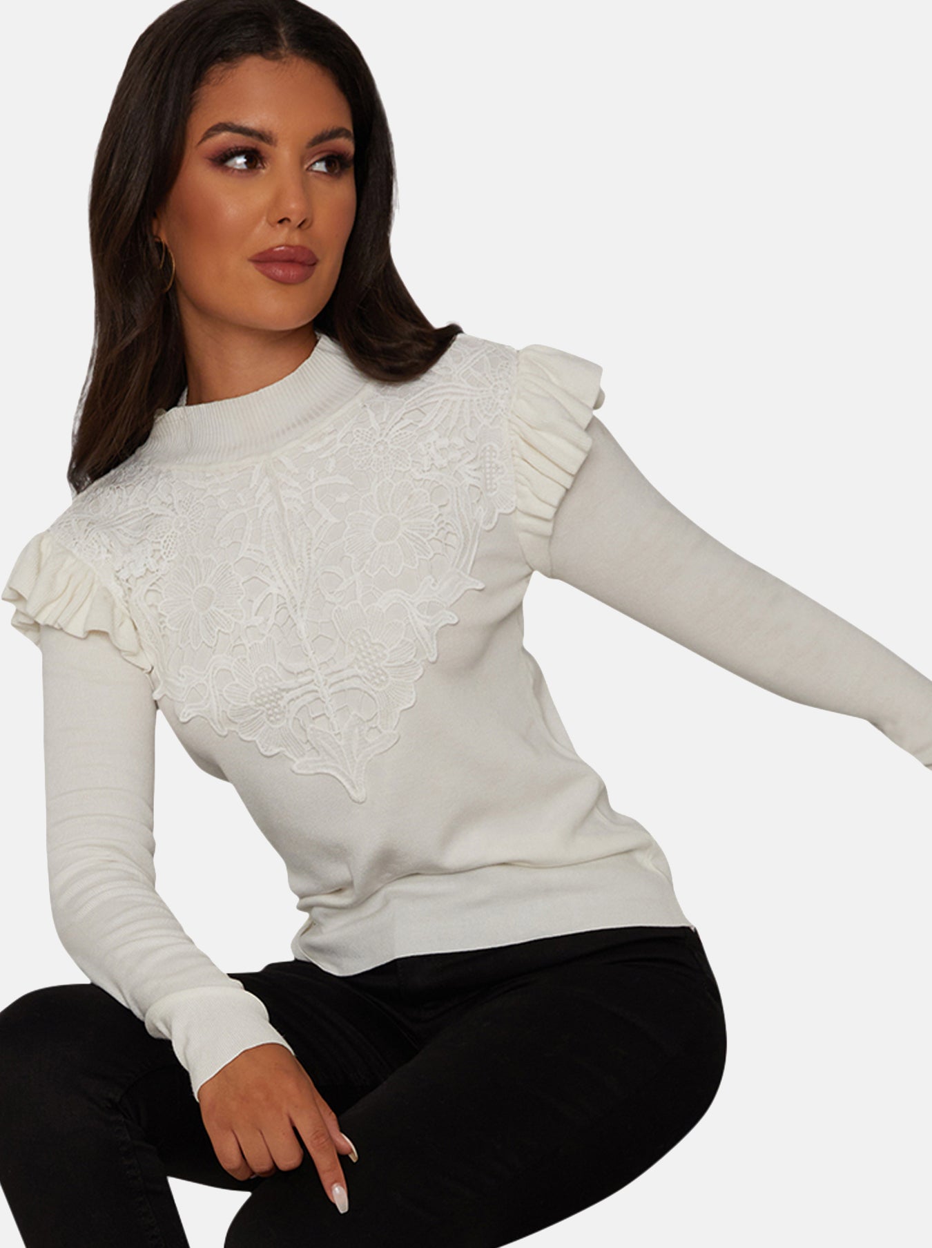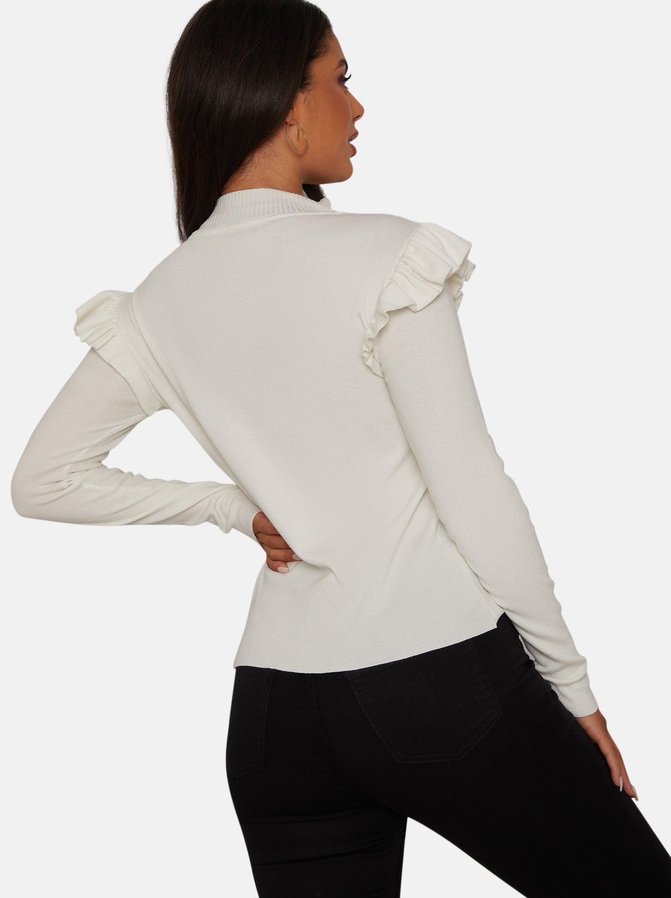 Refresh your knitwear collection this season with this jumper in elegant white. Featuring frill trim details, keeping warm has never looked do elegant. Pair with heels and skinny trousers for the ultimate look