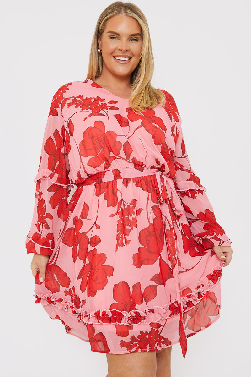 Floral Printed Chiffon Frill Detail Balloon Sleeve Mini Dress