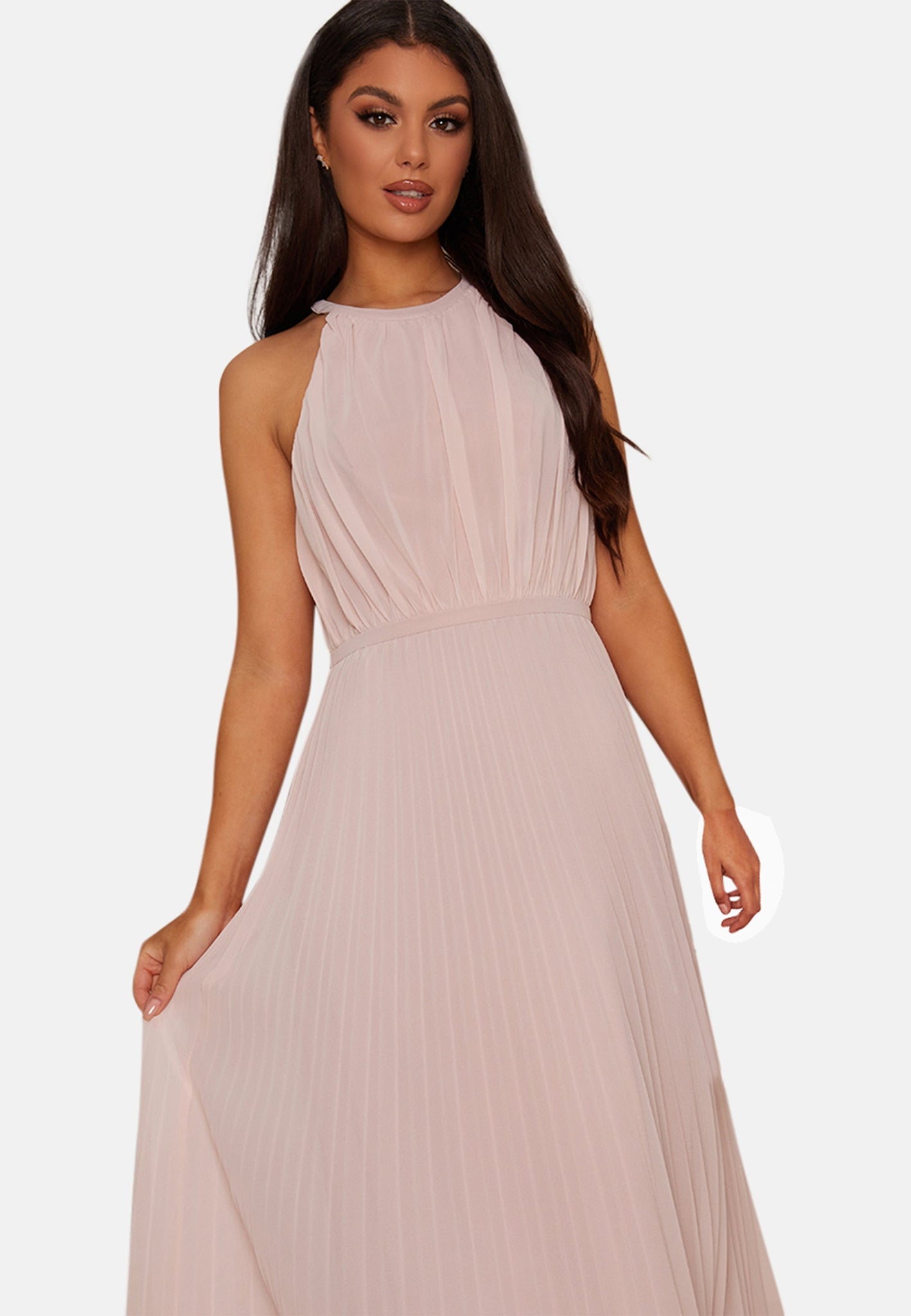 Additional Benefits: I have been designed with bridesmaid duties in mind, and made in a delicate pleated chiffon material with halterneck detailing. I am fitted at the waist to enhance your natural figure and have a maxi length to provide extra elegance.Â