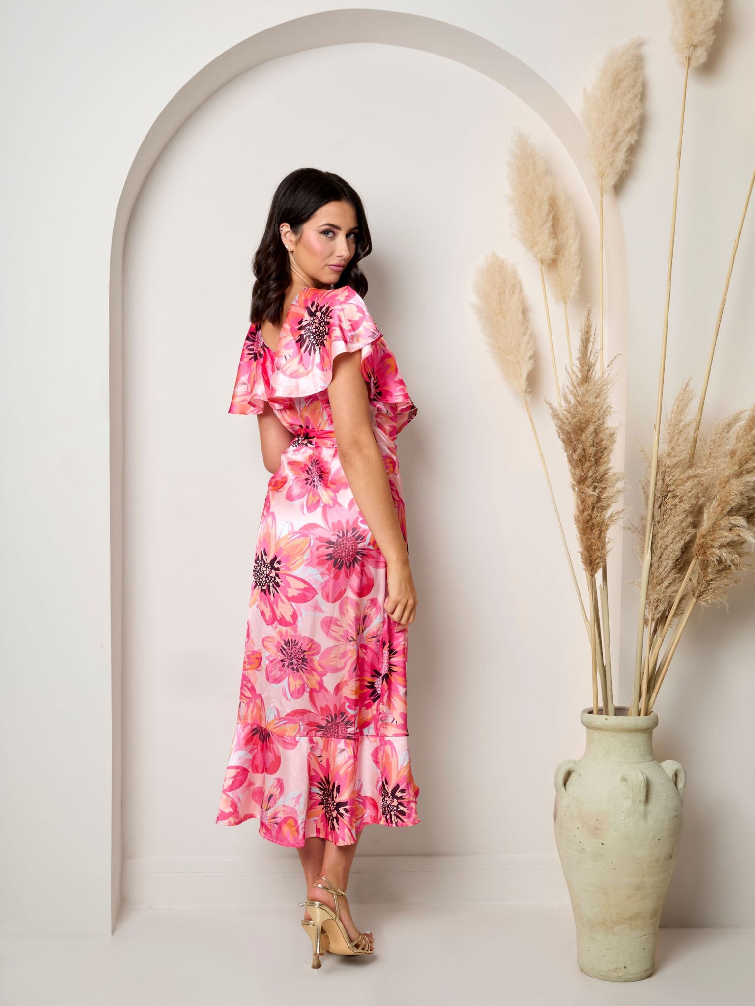 Plus Size Flutter Sleeve Satin Wrap Dress in Pink