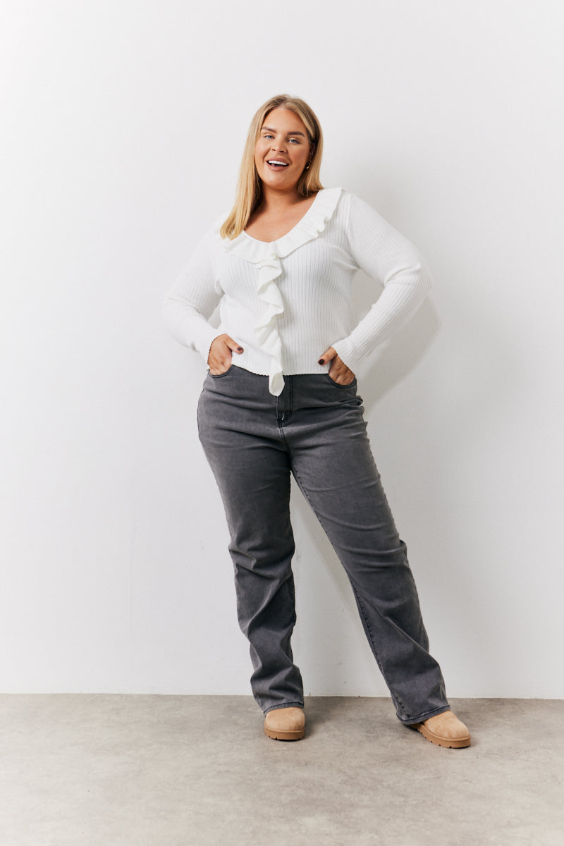 This cute knitted top will be your go to this season. In cream, featuring a frill detail, style it with your favourite pair of jeans or PU trousers to complete the look.