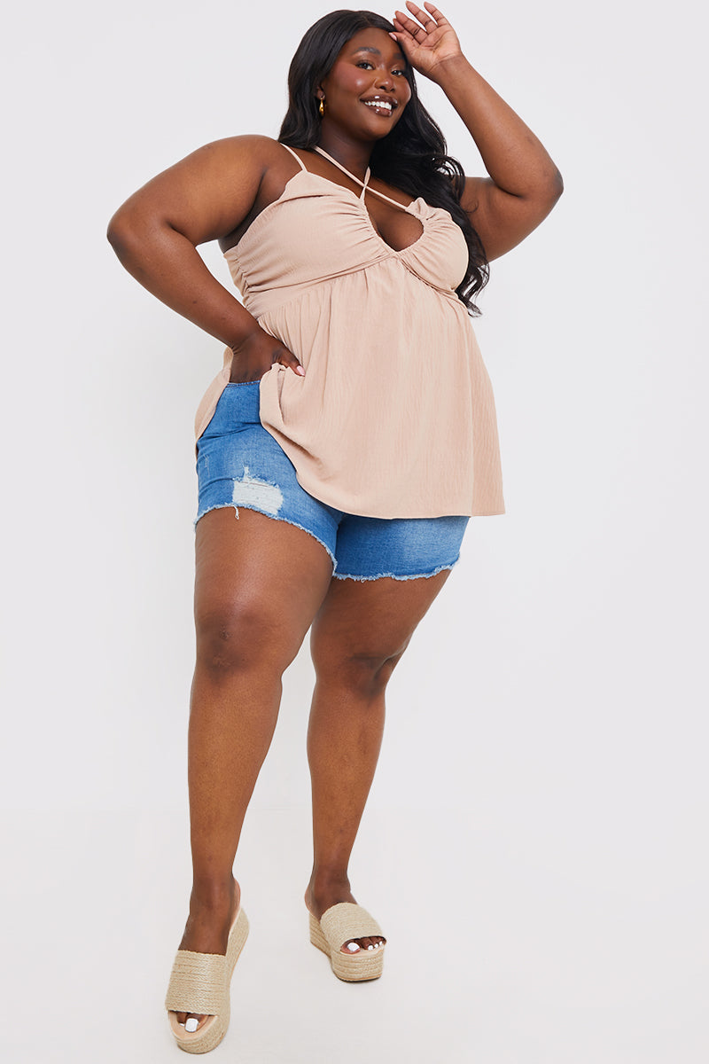 Update your basics with our new stone ruched halterneck cami top. Wear with jeans or shorts for the perfect look.