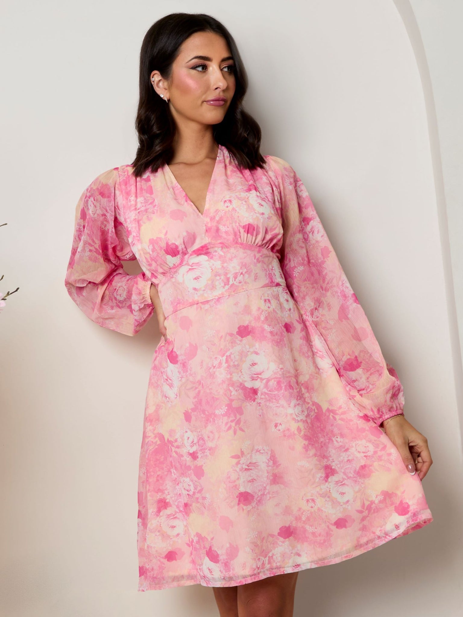Plus Size Long Sleeve Floral Mini Dress in Pink