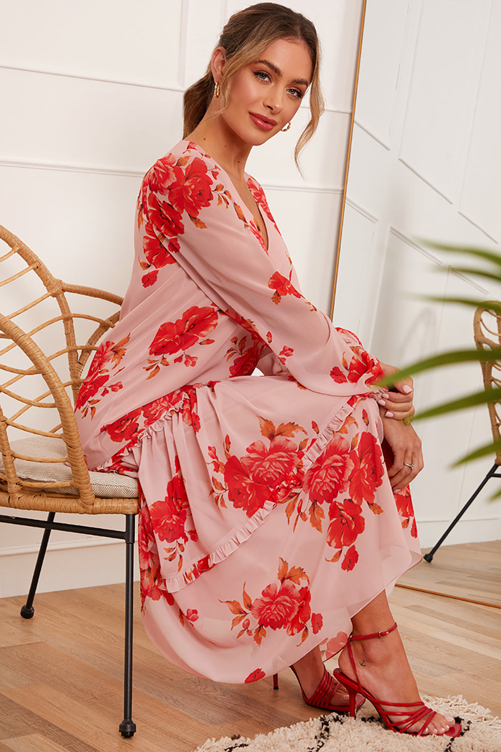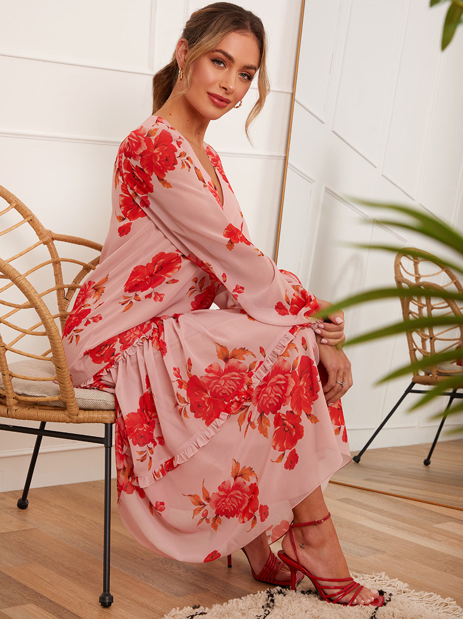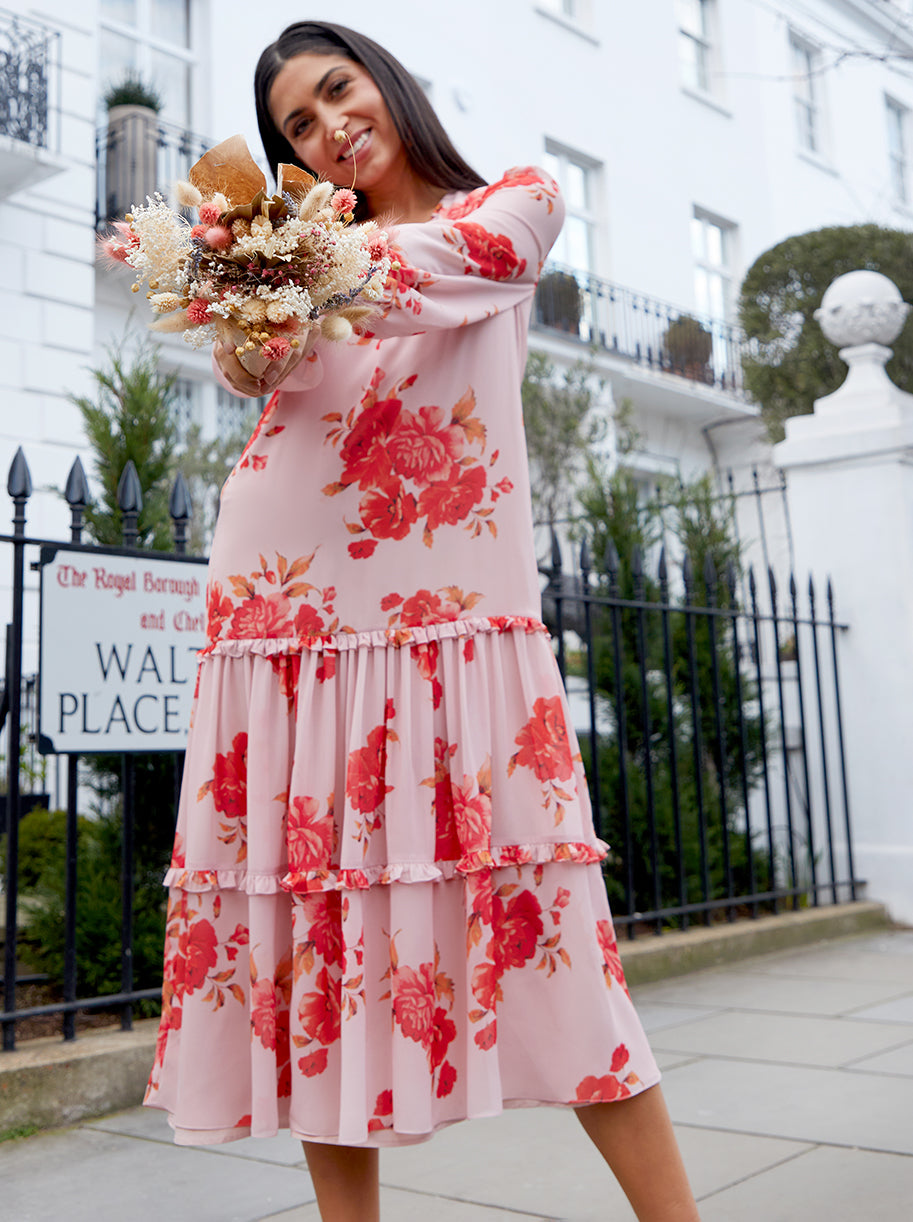 Long Sleeve Floral Printed Midi Dress in Pink