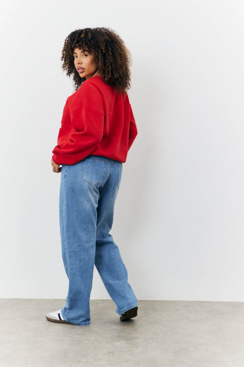 Go bold with our new red fITS varsity sweatshirt. Featuring a 97 print, this will make the most simple bottoms look better. Wear with jeans, or leggings for a vibey look we love.