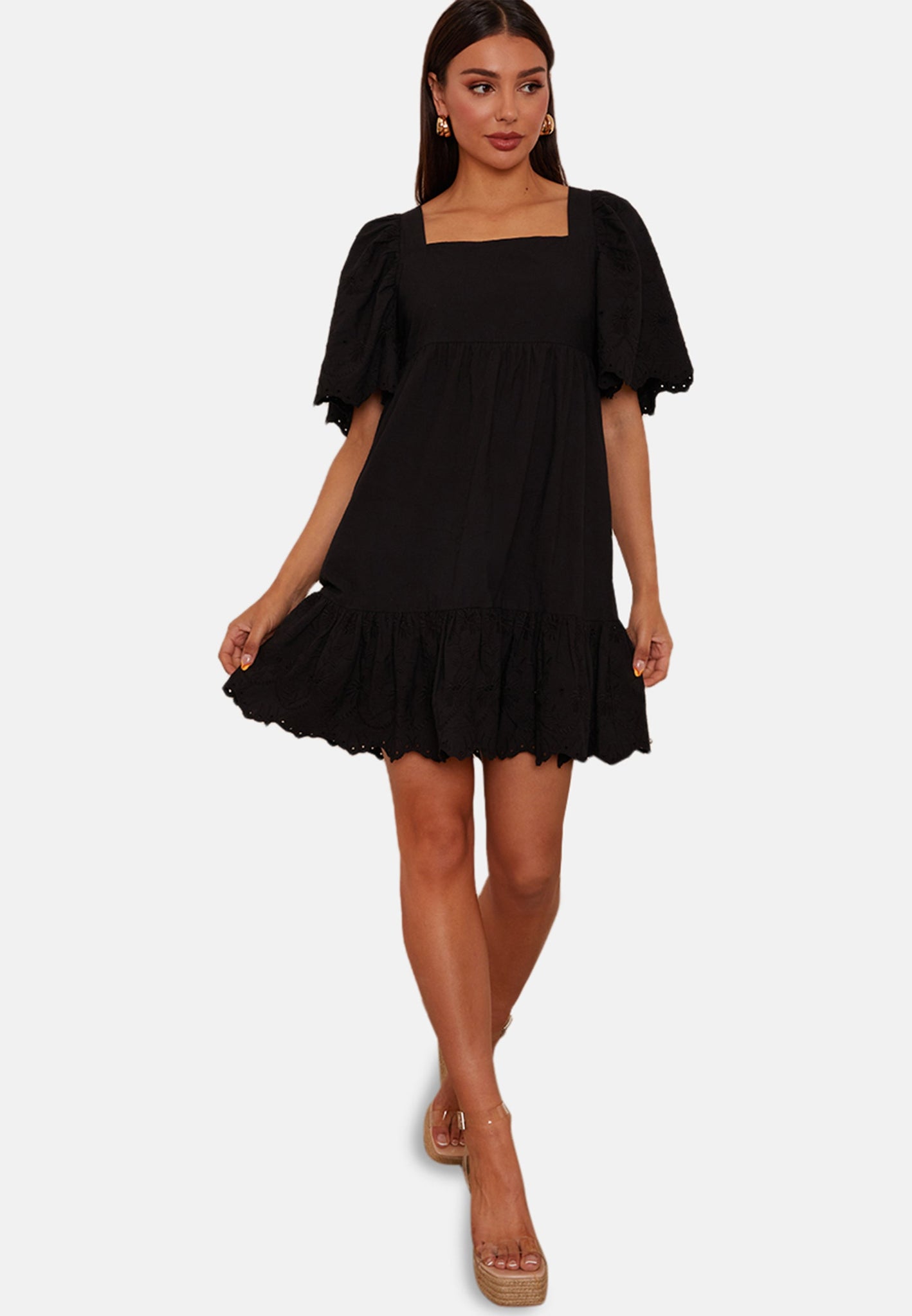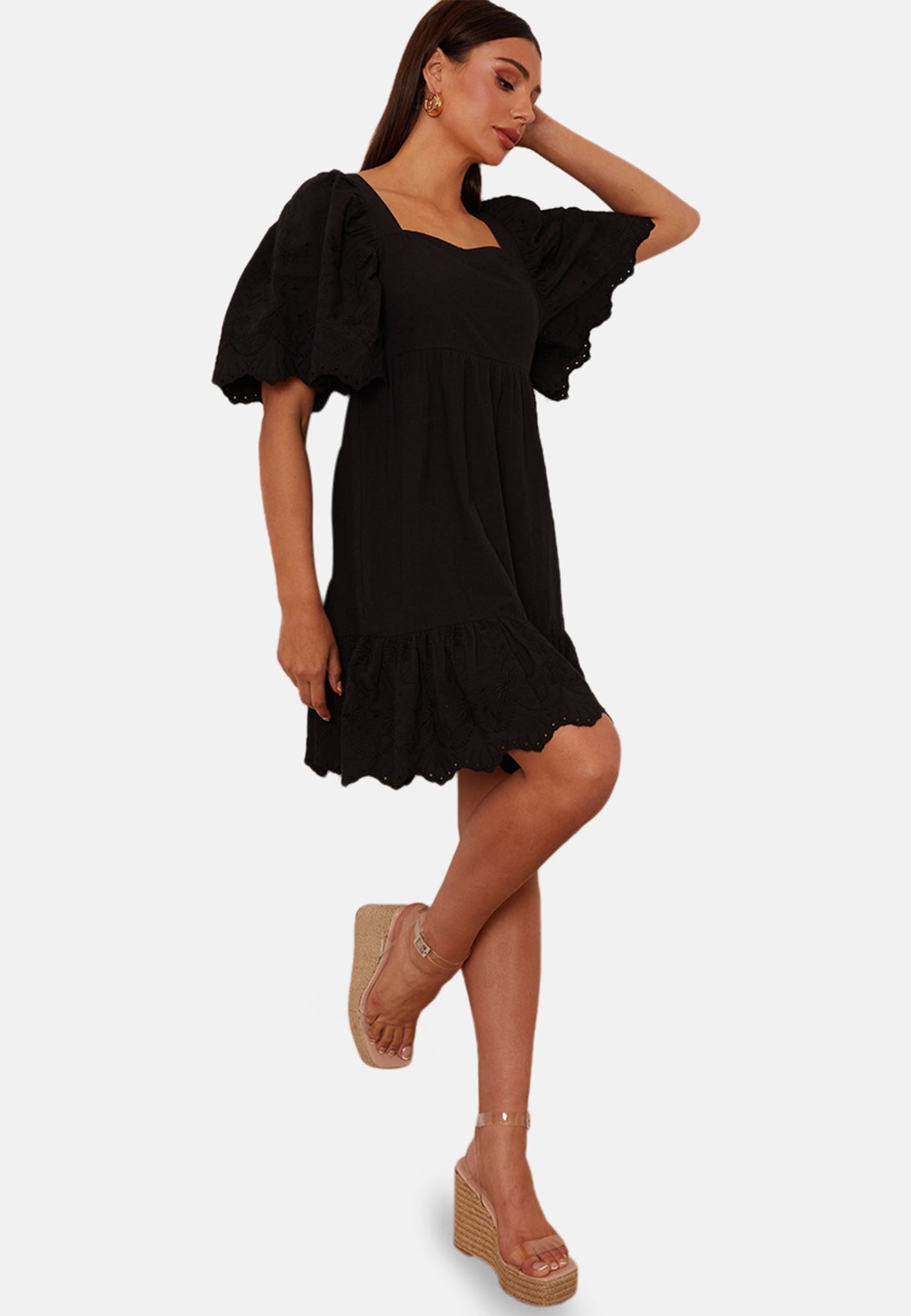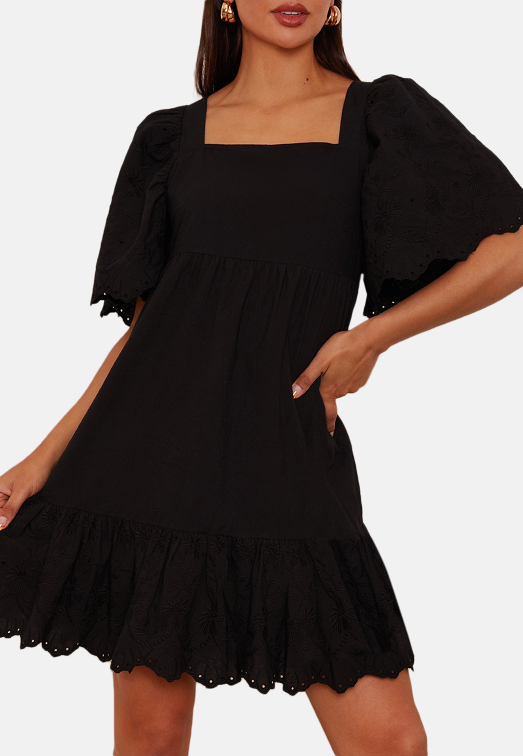 Broderie Anglaise Sleeve Poplin Mini Dress in Black