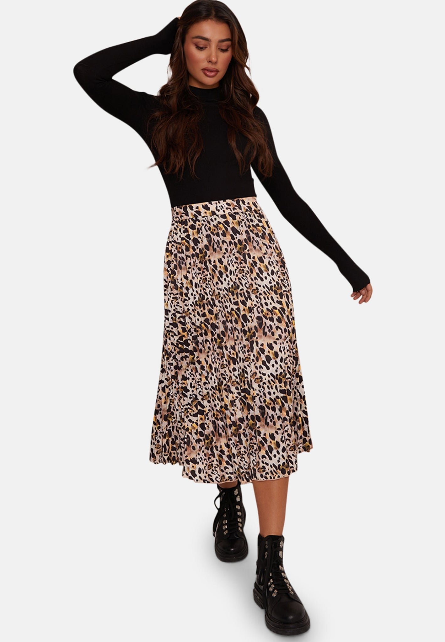 Whether you're going to work or going for drinks with the girls, do it in style without the newest animal print midi skirt. Giving you a smooth satin feel as well as a waistband hugging your waist. Pair with a turtle neck jumper and chunky heels for a cozy look