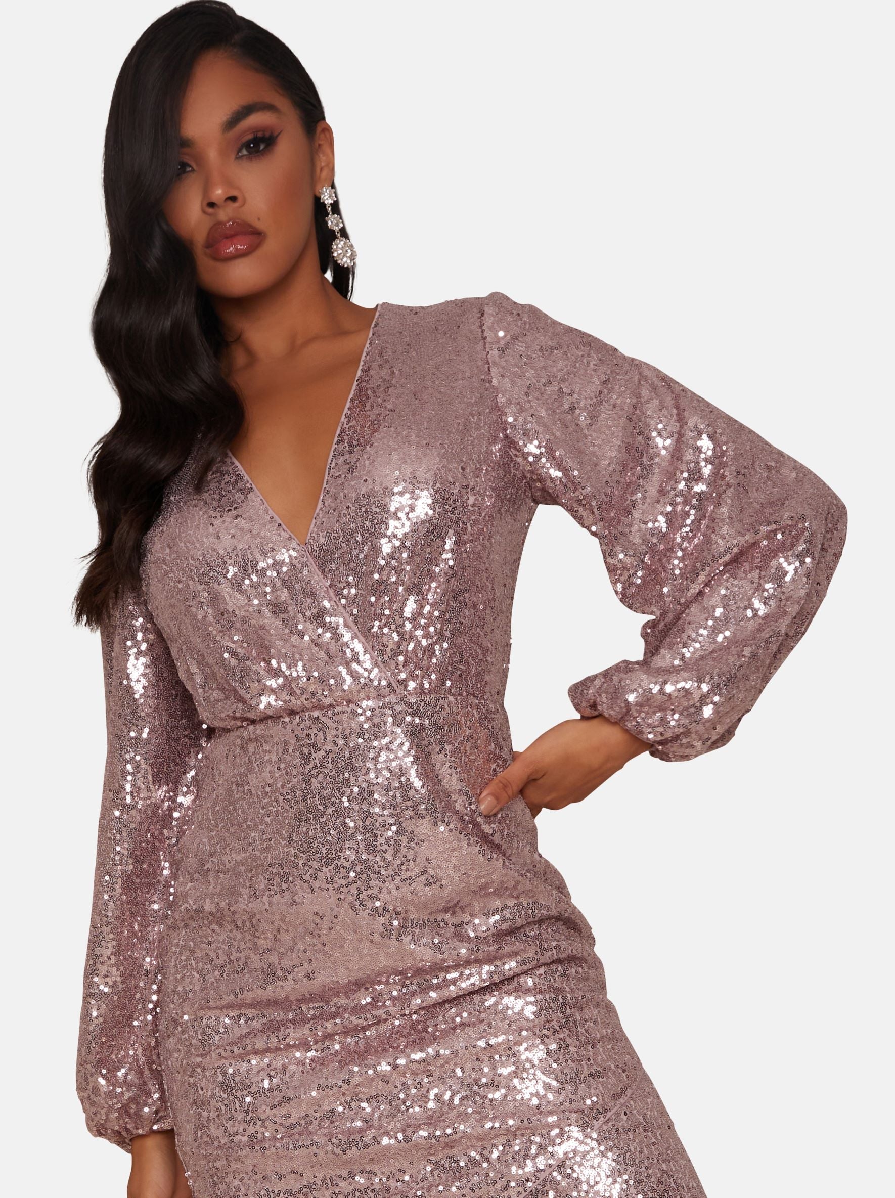The show-stopper dress that is waiting for you, this dress is total glitz and glam. A stunning pink dress with mini sequins, full-length sleeves, plunge neckline. Pair with heels and sparkly jewellery for the full glam
