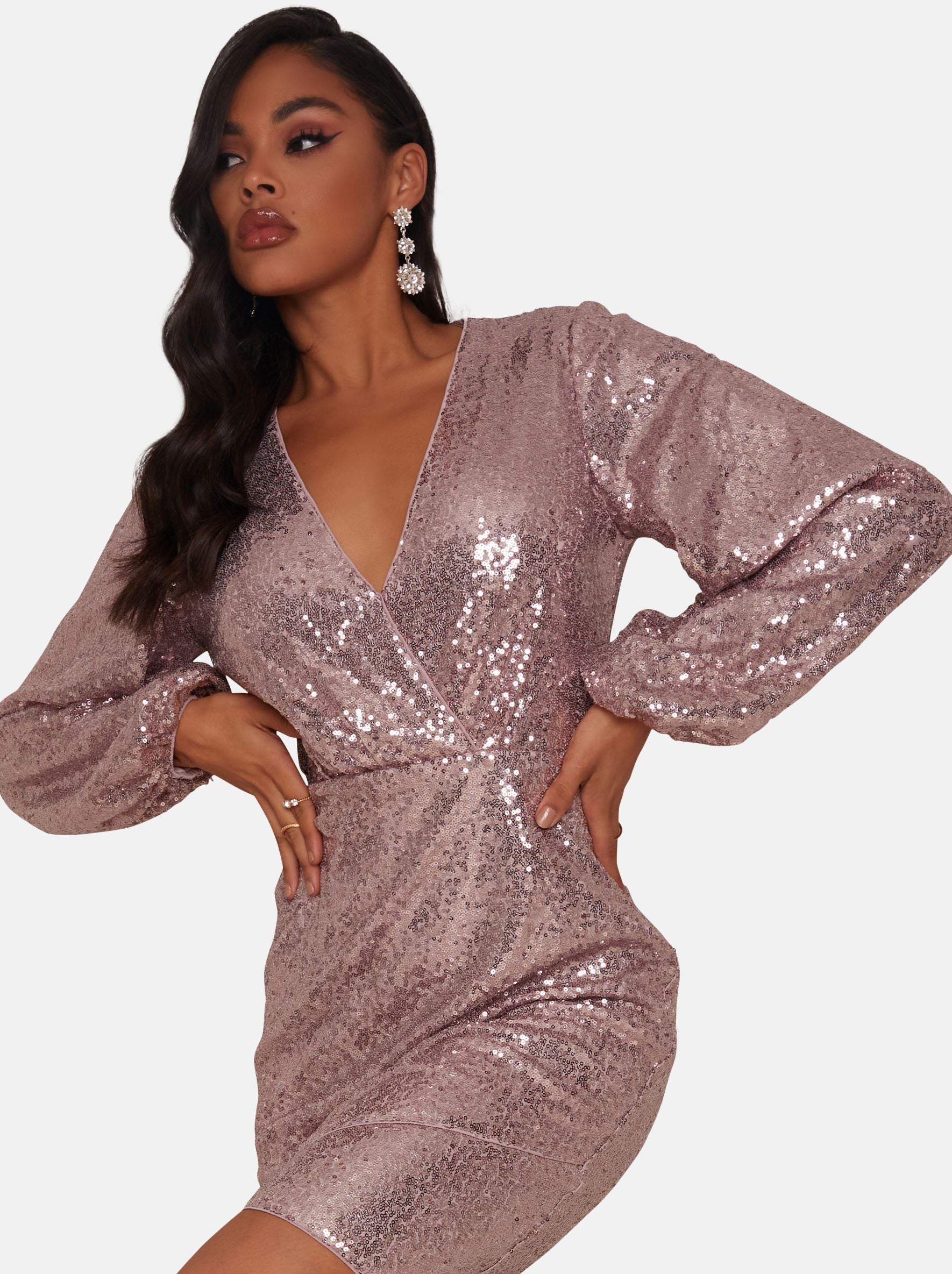 Long Sleeve Plunge Sequin Bodycon Mini Dress in Pink