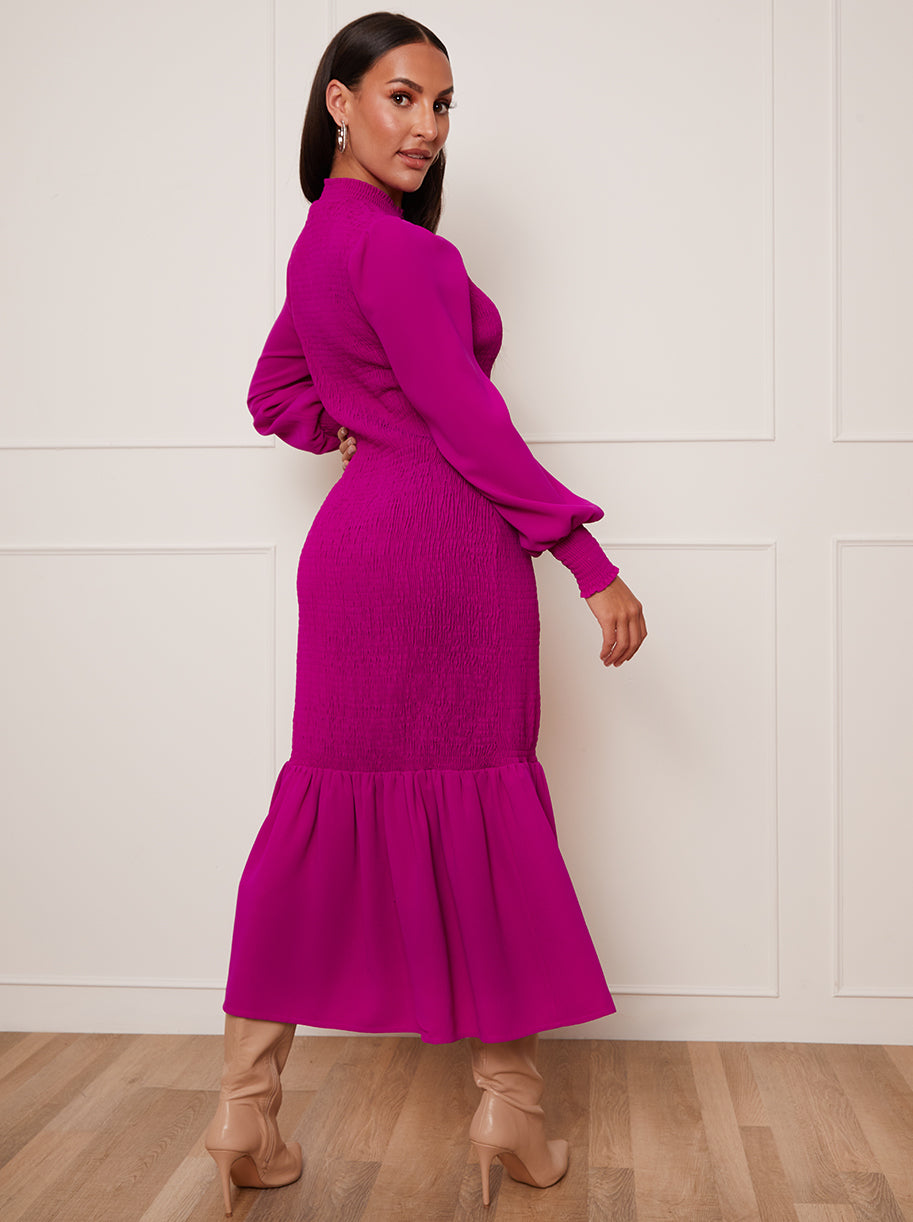 Petite Long Sleeve Shirred Maxi Dress in Pink