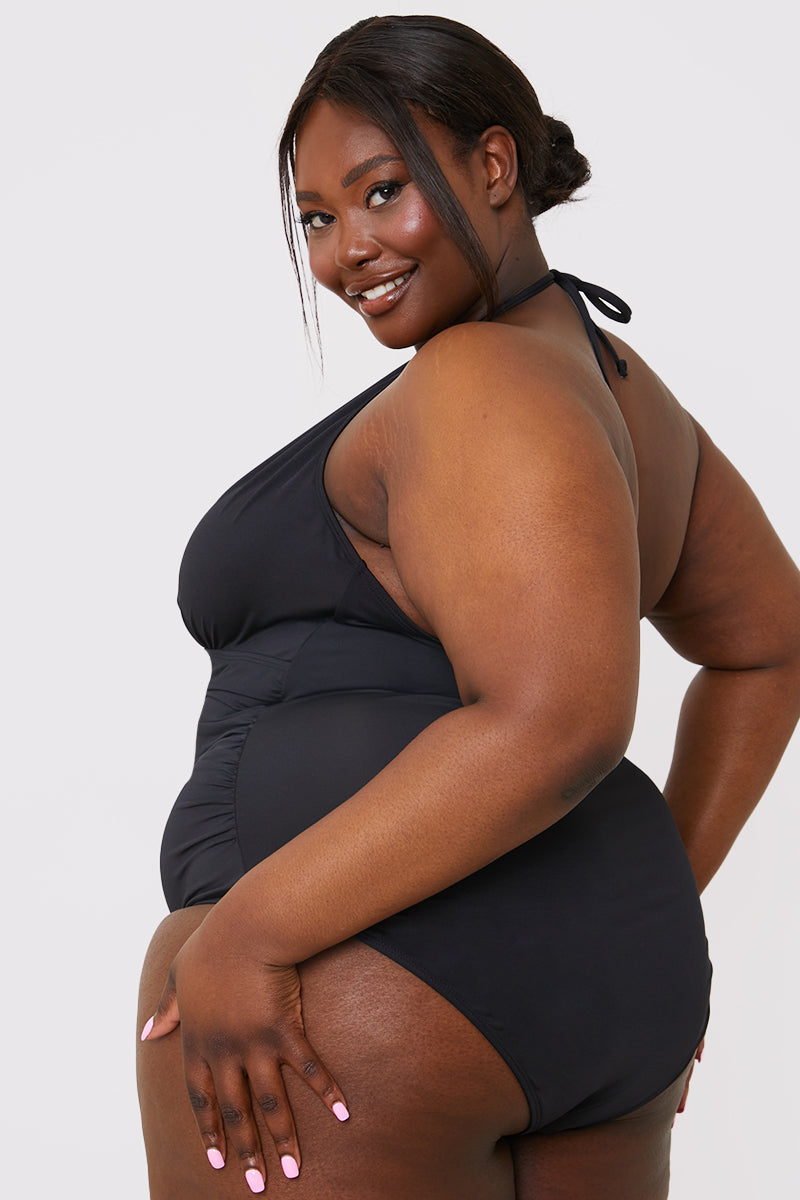 This black ruched halter-neck swimsuit is perfect for the summer season. Pair with sandals and a beach cover-up for a fab holiday fit.
