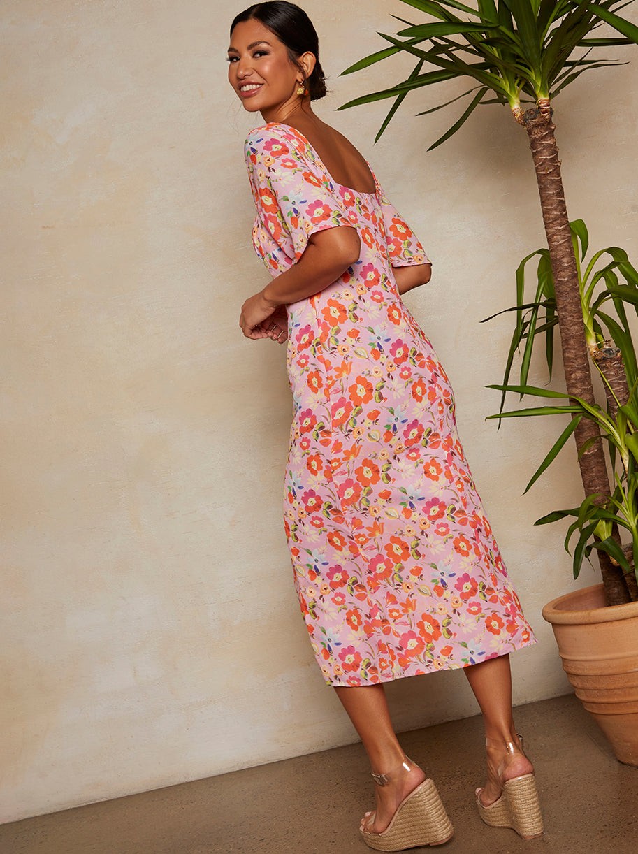 Short Sleeve Square Neck Floral Midi Dress in Pink