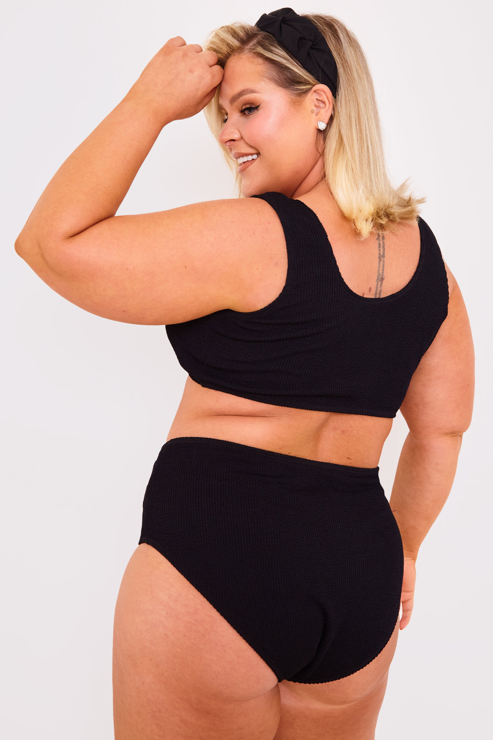 Get ready for the summer with this gorgeous bikini top. In black with a textured fabric and ring strap detail, pair with the matching bottoms and a cover up for a look we love!