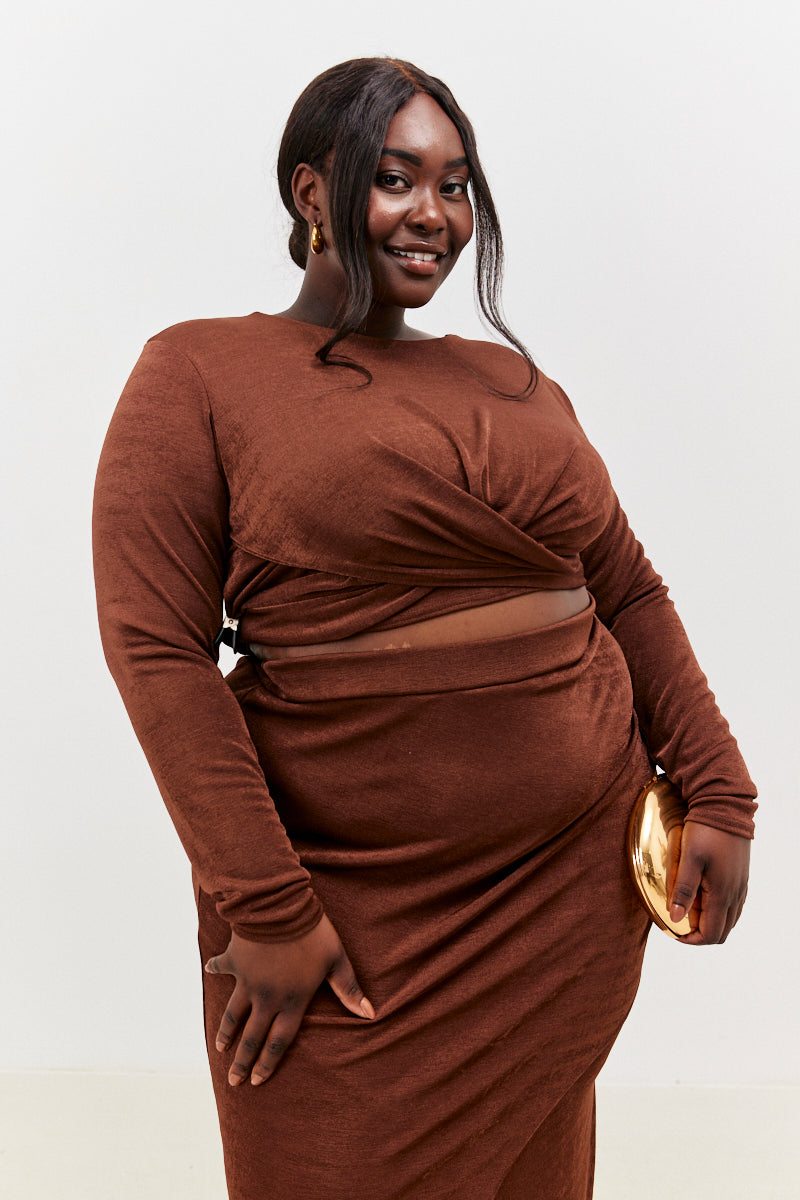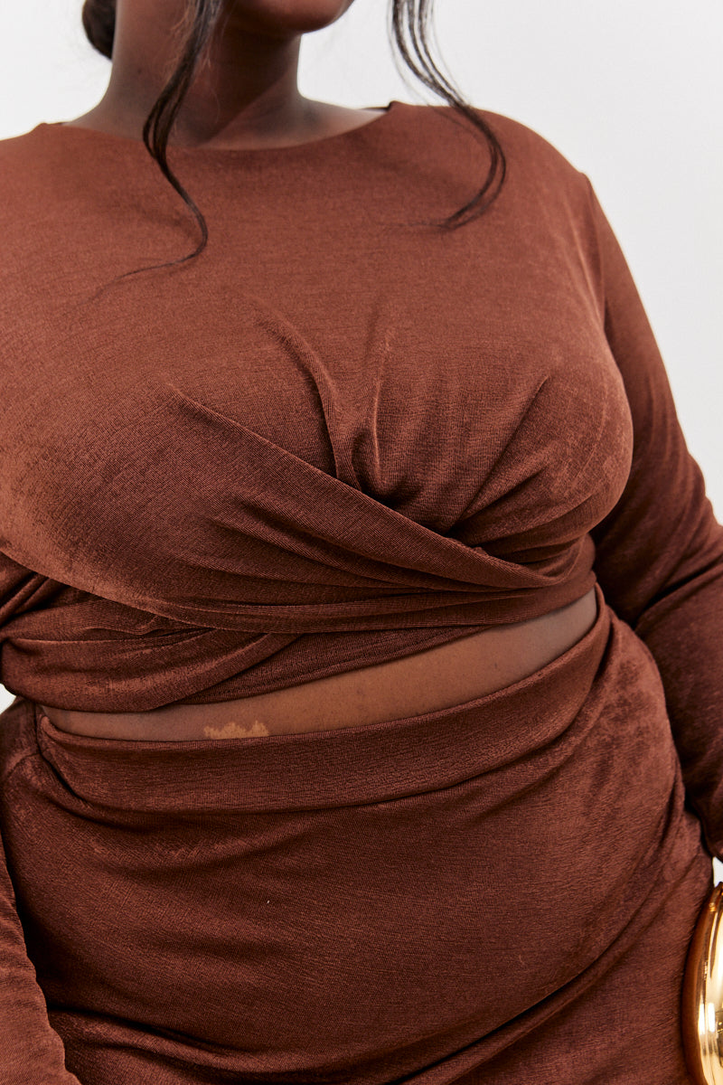 You can never go wrong with a co-ord and our new chocolate acetate crop top. It will be your fave. Pair with its matching skirt for a look that we love.